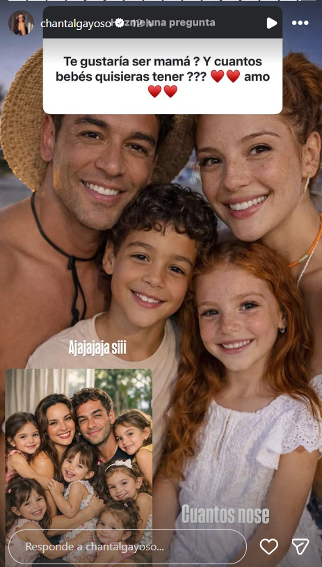 Pues bien, ahora en las historias de su cuenta de Instagram una usuaria le preguntó: "¿Te gustaría ser mamá? ¿y cuántos bebés quisieras tener?". A esto Chantal Gayoso respondió con una imagen generada con la inteligencia artificial, que la muestra a ella y a Thiago con sus hijos. "Sii", indicó, confirmando que esto está en sus planes, aunque no sabe cuántos niños tendrían.