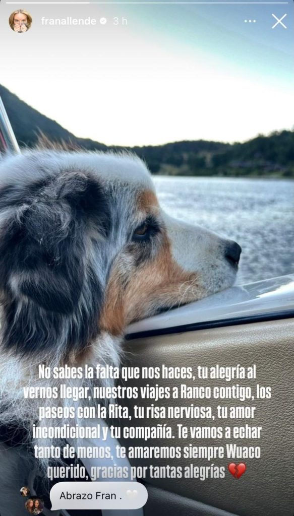 Por su parte Francisca Allende, esposa de Jorge Zabaleta, también le dedicó unas palabras a Wako en las historias de su cuenta de Instagram. "No sabes la falta que nos haces, tu alegría al vernos llegar, nuestros viajes a Ranco contigo, los paseos con la Rita, tu risa nerviosa, tu amor incondicional y tu compañía. Te vamos a echar tanto de menos, te amaremos siempre Wako querido, gracias por tantas alegrías", escribió.