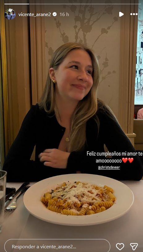 En las historias de su cuenta de Instagram, Vicente dejó una foto de Christine, posando en un restaurante, probablemente en una cita de los tortolitos. Y sobre ella añadió un breve, pero romántico mensaje a modo de saludo. "Feliz cumpleaños mi amor. Te amo", indicó el joven hijo de la pareja de animadores.