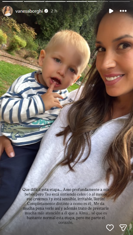 Pues bien, en el texto indicó: "Qué difícil esta etapa… amo profundamente a mis bebés, pero Teo está sintiendo celos (o al menos eso creemos) y está sensible, irritable, llorón!". Según indicó, este es un cambio que ha visto más recientemente, pues antes no solía tener este tipo de actitudes. Eso sí, Vanesa Borghi reconoció que entiende que es normal que esto ocurra.