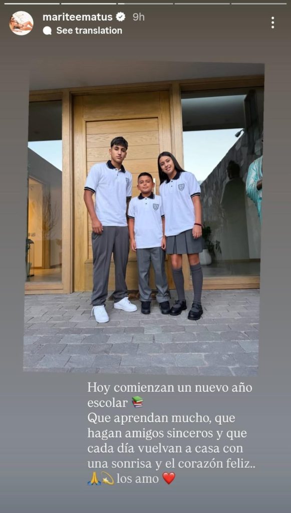 Marité Matus también fue una de las famosas que tuvo que ir al colegio con más de uno de sus hijos. Es que viendo cómo van creciendo, la empresaria partió con sus tres retoños, a quienes presumió en una foto luciendo radiantes de pies a cabeza. "Hoy comienza un nuevo año escolar. Que aprendan mucho, que hagan amigos sinceros y que cada día vuelvan a casa con una sonrisa y el corazón feliz. Los amo!", sostuvo.
