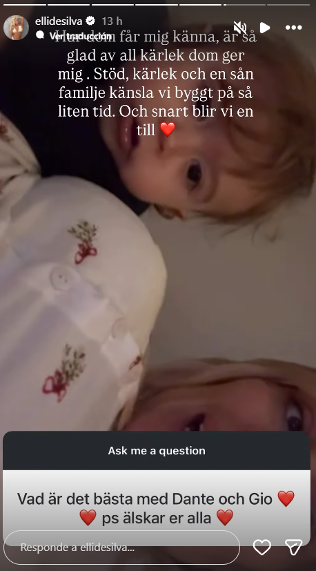 Resulta que Elli de Silva, la novia de Dante Lindhe, compartió en las historias de su cuenta de Instagram un video donde aparece el hijo de la actriz y el cantante. En esta señala cómo la han acompañado durante su embarazo. "Estoy tan feliz por todo el amor que me dan. Apoyo, amor y un fuerte sentido de familia que hemos construido en tan poco tiempo. Y pronto seremos uno más", dijo la rubia.