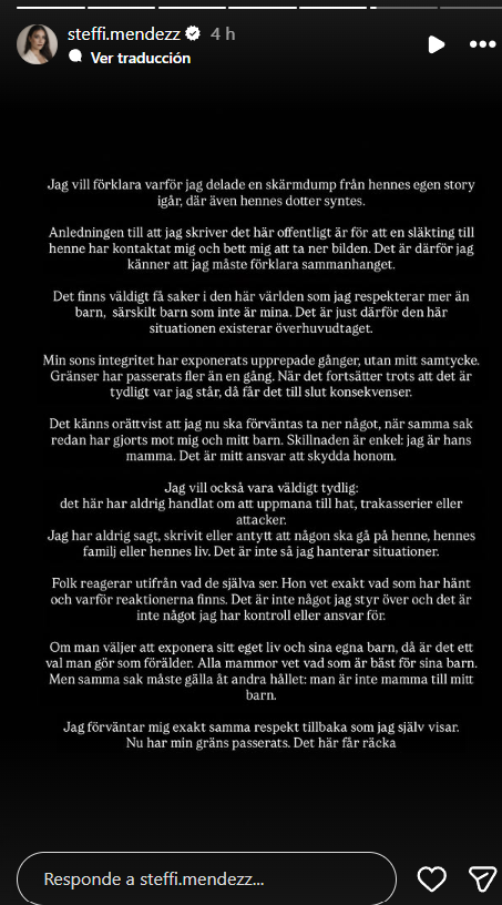 Esta publicación no dejó para nada indiferente a Steffi Méndez, que en su propia plataforma compartió un texto señalando: "He dicho en repetidas ocasiones que mi hijo no debe aparecer en las redes sociales de otras personas. Soy su tutora legal y soy yo quien decide. Punto. Que esto se ignore de todos modos es profundamente irrespetuoso".