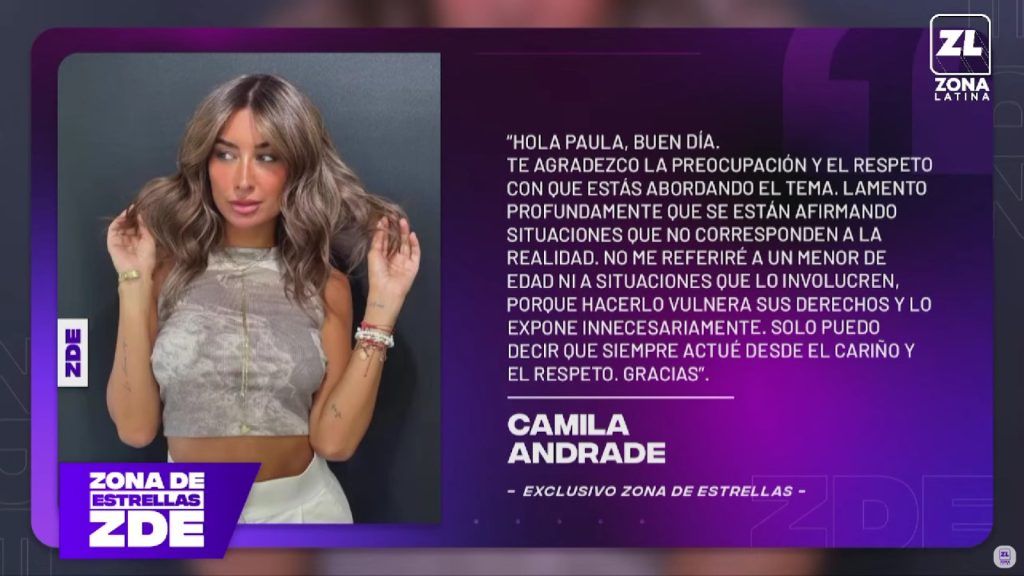 De esta manera Camila Andrade hizo hincapié: "No me referiré a un menor de edad ni a situaciones que lo involucren, porque hacerlo vulnera sus derechos y lo expone innecesariamente, solo puedo decir que siempre actué desde el cariño el respeto, gracias", dejando entrever una crítica a Carla Jara por mencionar a su hijo en televisión con la polémica.