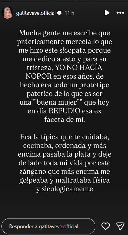 La figura llamada Gativa Veve compartió un descargo en las historias de su cuenta de Instagram, donde indicó: "Mucha gente me escribe que prácticamente merecía lo que me hizo este psicópata porque me dedico a esto, y para su tristeza, yo no hacía nopor en esos años. De hecho era un prototipo patético de lo que es ser una 'buena mujer' que hoy en día repudio esa ex faceta de mí.