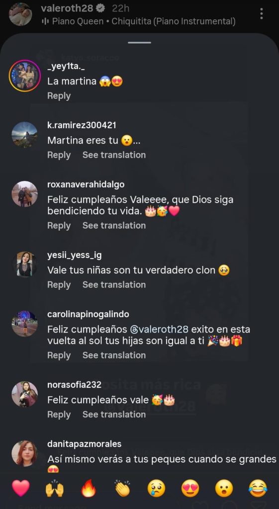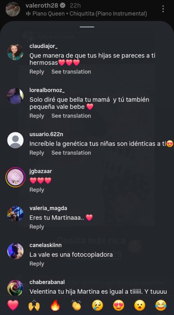 "Qué manera de que tus hijas se parecen a ti, hermosas", "increíble la genética, tus niñas son idénticas a ti", "eres tú Martina", "la Vale es fotocopiadora", "Valentina, tu hija Martina es igual a ti", "tus niñas son tu verdadero clon", le escribieron a Vale Roth en las reacciones, dejando más que claro la sorpresa que generó ver lo igualita que es su bebé y ella.
