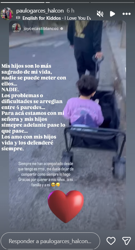 Y tras mantener silencio por lo ocurrido, finalmente Paulo Garcés, hermano de Óscar Garcés y padre de los menores de edad, alzó la voz y decidió hablar sobre el tema. En las historias de su cuenta de Instagram publicó una serie de imágenes donde deja claro que su prioridad siempre será su familia y sus hijos, por lo que no dejará que los involucren en nada.