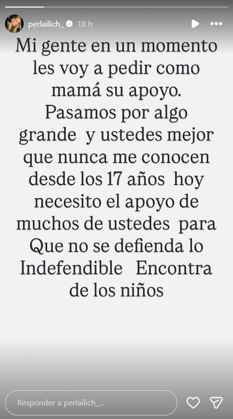 "Pasamos por algo grande y ustedes mejor que nunca me conocen desde los 17 años. Hoy necesito el apoyo de muchos de ustedes para que no se defienda lo indefendible en contra de los niños", sostuvo Perla Ilich, desatando comentarios inmediatos en el posteo, donde muchas internautas dejaron sus muestras de cariño.