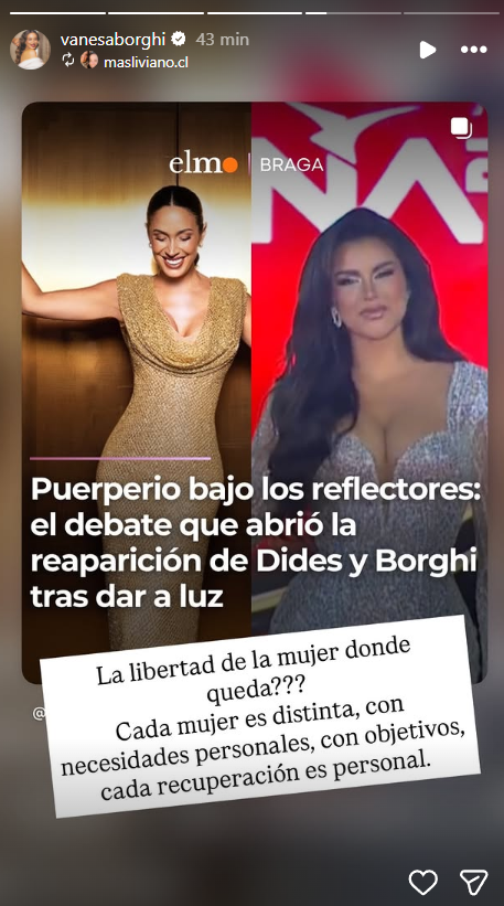 Y precisamente esta situación llamó la atención en redes, donde El mostrador hizo un especial titulado: "Puerperio bajo los reflectores: el debate que abrió la reaparición de Dides y Borghi tras dar a luz". En este se vieron múltiples comentarios. De hecho una usuaria lo posteó en sus historias dejando un mensaje que luego tomó Vanesa Borghi.