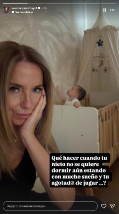 En las historias de su cuenta de Instagram la animadora publicó una postal tipo selfie, donde se ve de fondo al bebé mirando la pared y delatando su energía. "Qué hacer cuando tu nieto no se quiere dormir aún estando con mucho sueño y tú agotada de jugar?", escribió la mujer sobre la postal que fue rescatada por AR13.