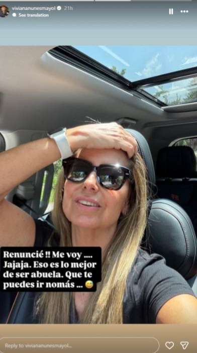 Y al parecer poco después finalizó con esta ayuda, pues publicó otra foto desde su auto y en libertad, explicando entre risas que terminó esta visita y se pudo ir a su hogar tranquila, destacando la ventaja de ser abuela. "Renuncié!! Me voy jajaja... Eso es lo mejor de ser abuela, que te puedes ir nomás", sostuvo Viviana Nunes en sus redes.