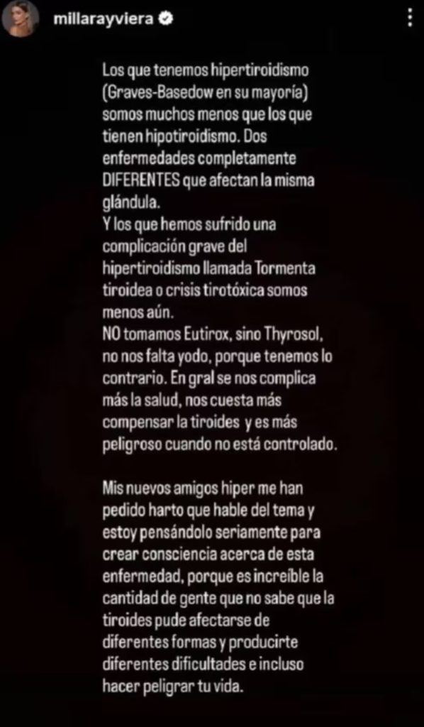 "Mis nuevos amigos hiper me han pedido harto que hable del tema y estoy pensándolo seriamente para crear conciencia acerca de esta enfermedad, porque es increíble la cantidad de gente que no sabe que la tiroides puede afectarse de diferentes formas y producirte diferentes dificultades e incluso peligrar tu vida", escribió finalmente Millaray Viera, alzando la voz por la seriedad de su enfermedad.