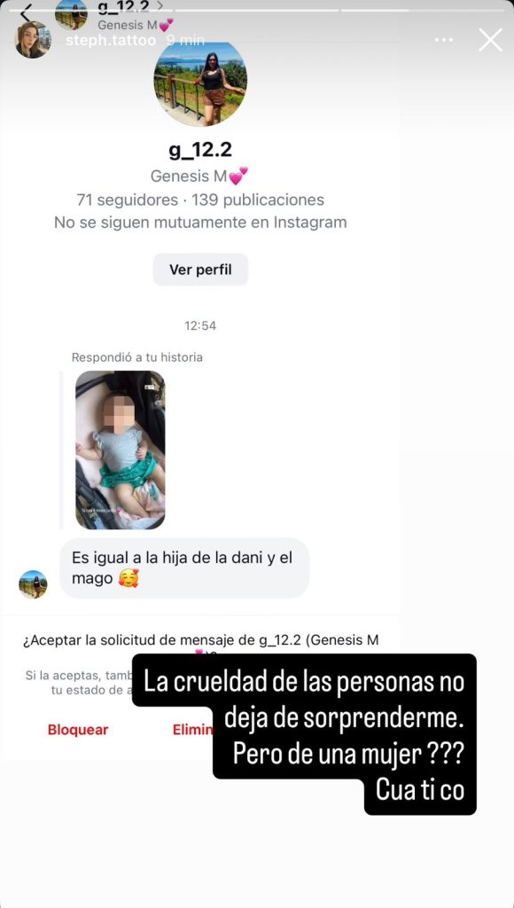 Sin embargo, tras publicar recientemente las imágenes de su bebé, la emoción se vio empañada por un comentario desubicado que recibió en la misma plataforma. “Es igual a la hija de la Dani y el Mago”, le escribieron, un mensaje que fue percibido como cruel y fuera de lugar.