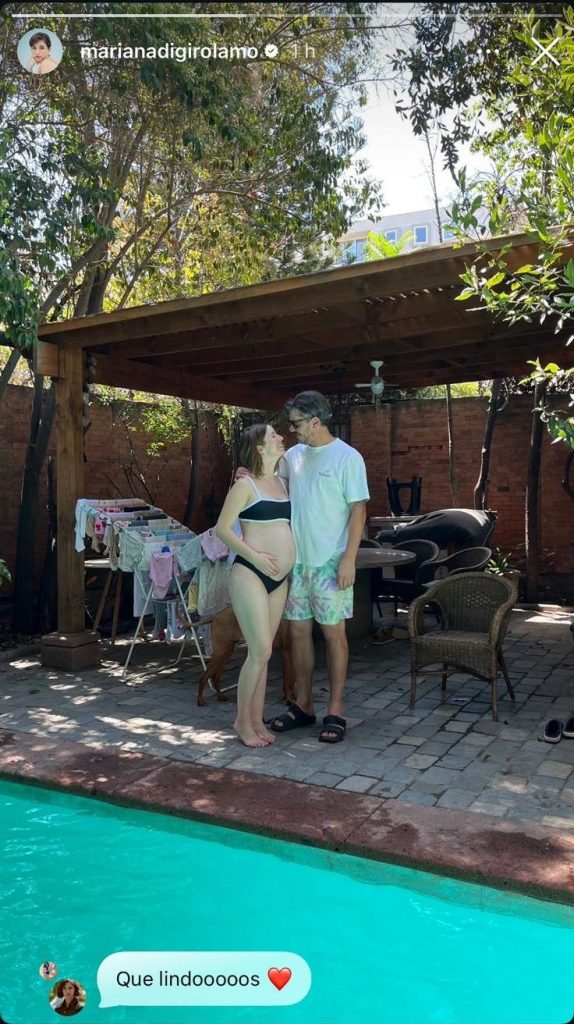 En la fotografía, que no para de sumar likes en la web, se puede ser a una sonriente Mariana di Girolamo mirando a su esposo y con una mano en su panza, mientras que él la tiene abrazada y también la mira sonriente.