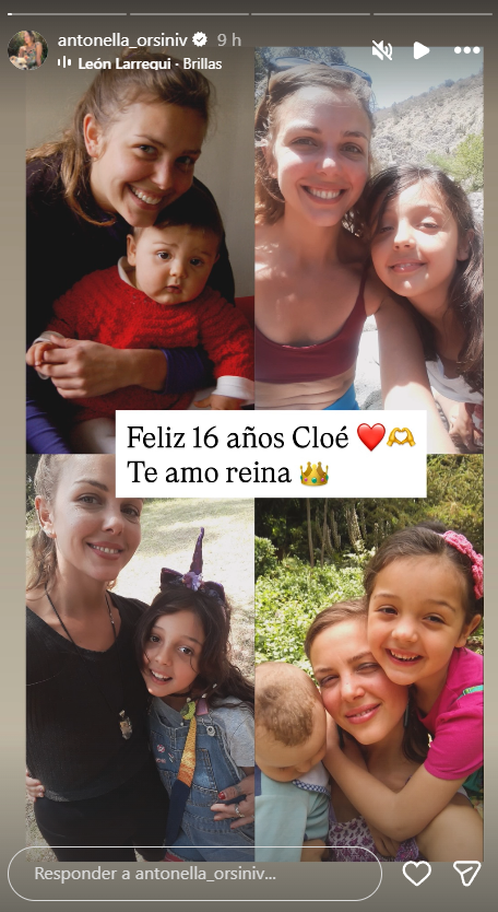 La actriz dejó una imagen en las historias de su cuenta de Instagram, donde añadió cuatro postales del recuerdo con su retoña, mostrando algunas de las etapas que ha vivido desde muy pequeñita, cuando apenas era un bebé en sus brazos, hasta la adolescencia. "Feliz 16 años Cloé. Te amo reina", escribió la intérprete sobre los registros.