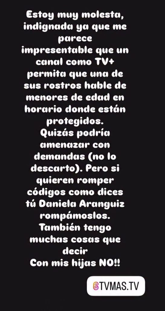 Las declaraciones provocaron una inmediata reacción de Francoise Perrot, quien utilizó sus redes sociales para manifestar su molestia, especialmente por el hecho de que se mencionara a sus hijas en televisión. “Estoy muy molesta, indignada, que ya me parece impresentable que un canal, como TV+, permita que uno de sus rostros hable de menores de edad en horario donde están protegidos”, escribió en sus historias de Instagram.