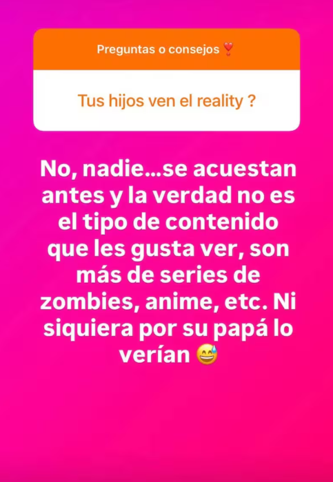 "¿Tus hijos ven el reality?", la interrogaron en la red social, a lo que respondió que en realidad sus hijos, y nadie en su casa, ve el programa. Por lo mismo recalcó este tampoco es el tipo de contenido que suele ver su clan, y que además, las transmisiones son tan tarde, que para el momento en que aparece en pantalla, ya están todos dormidos.