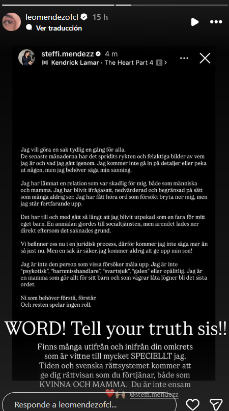 "¡Di tu verdad, hermana! Hay muchos desde afuera y desde dentro de tu círculo que son testigos de mucho, especialmente yo. El tiempo y el sistema judicial sueco te darán la justicia que mereces, tanto como mujer y madre. No estás sola", sentenció Leo Méndez Jr, que tras pasar días de salud complicado, no se mantuvo al margen de la delicada situación que tiene a su hermana en el frente.
